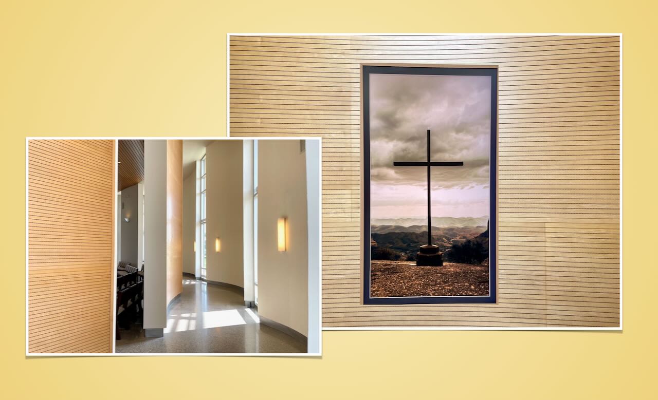 Each 55 inch panel is high quality in its resolution and presents art gallery quality imagery. The panels will be surrounded by a wooden frame in keeping with the wood condition throughout the ambulatory.