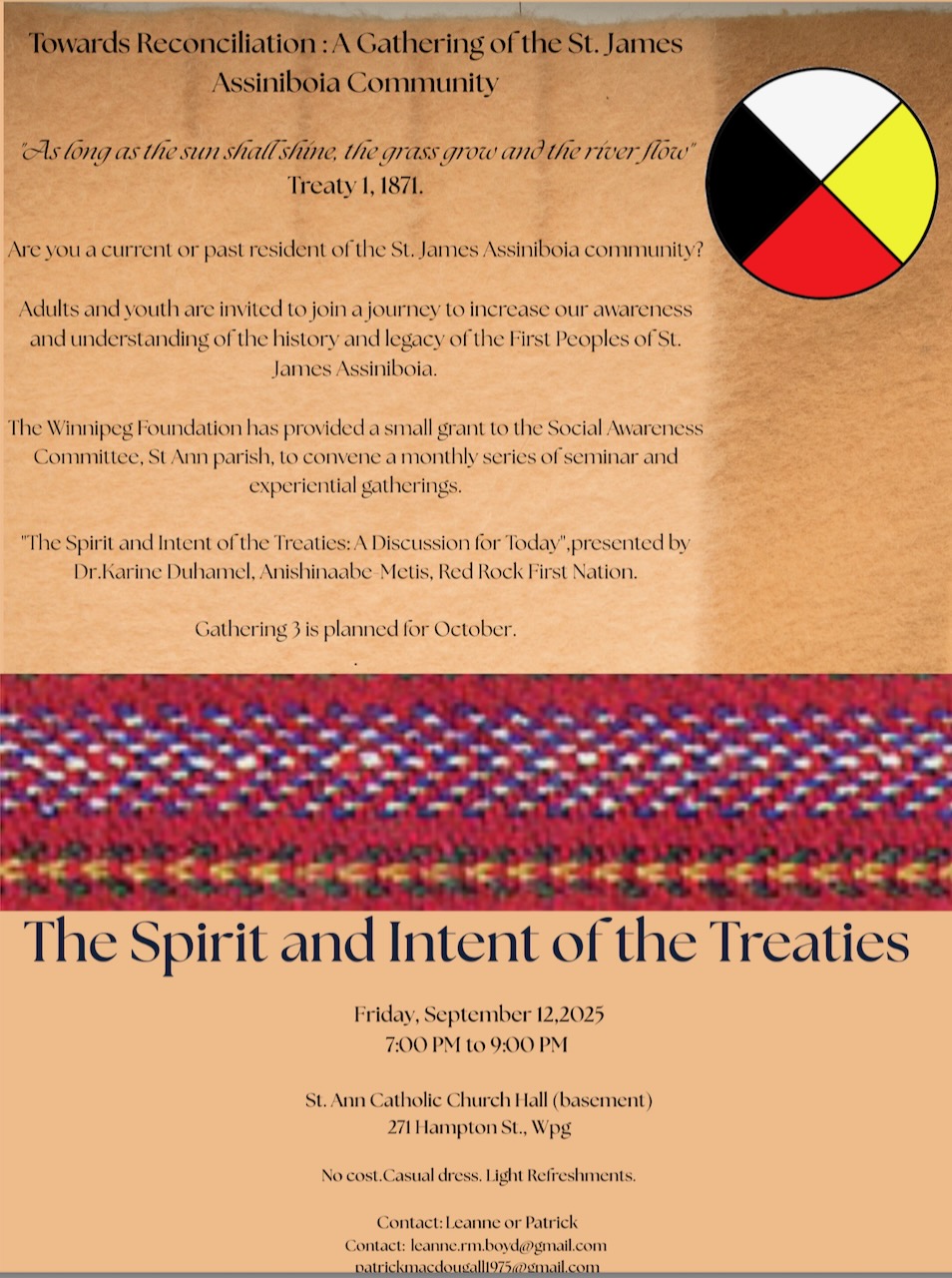 In this month devoted to Truth and Reconciliation, you are invited to participate in an evening with Dr. Karine Duhamel, an Anishinabe/Métis, woman and a dynamic speaker.  She will speak on The Spirit and Intent of the Treaties:  A Discussion for Today, Friday, September 12th, 7:00-9:00 p.m., at St. Ann’s Church, 271 Hampton Street, in St James (just west of Route 90).  No cost, light refreshments provided.