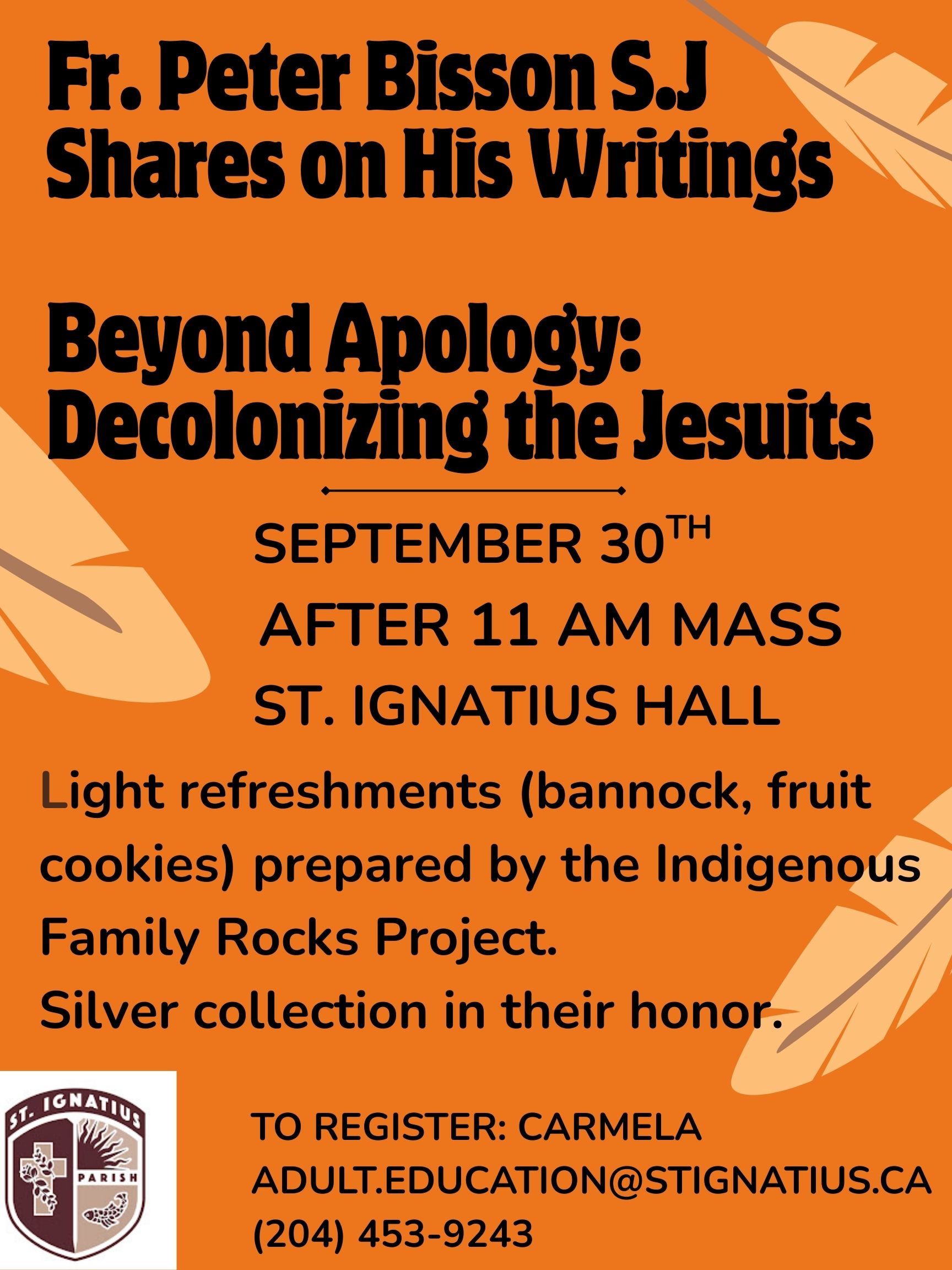 We are honoured to welcome Fr. Peter Bisson, SJ, who will share reflections from his work Beyond Apology: Decolonizing the Jesuits.