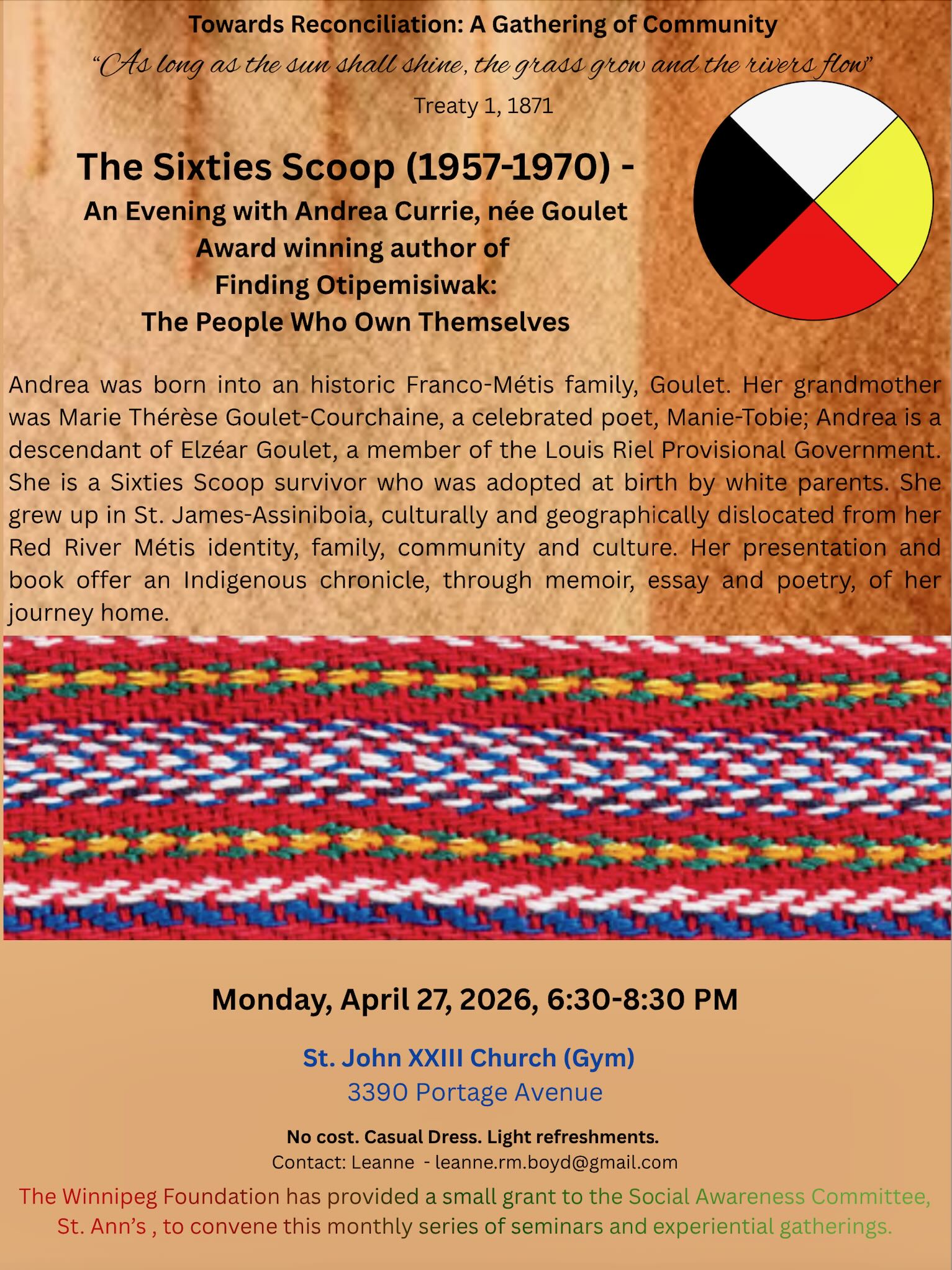 Join us Monday, January 26th, 6:00 p.m.-8:00 p.m., at St James-Assiniboia Library, 1910 Portage Avenue. Free to attend; refreshments served. Organized by the Social Awareness Committee of St. Ann Catholic Church.